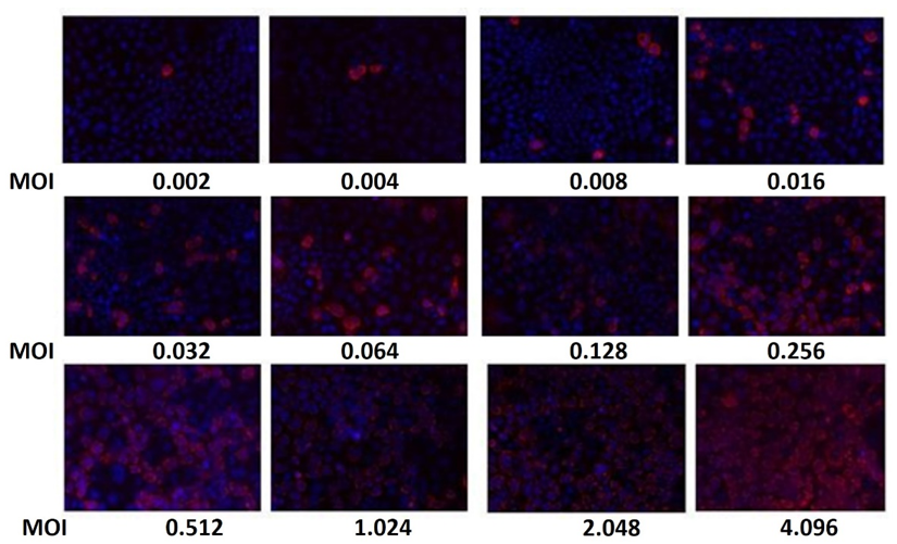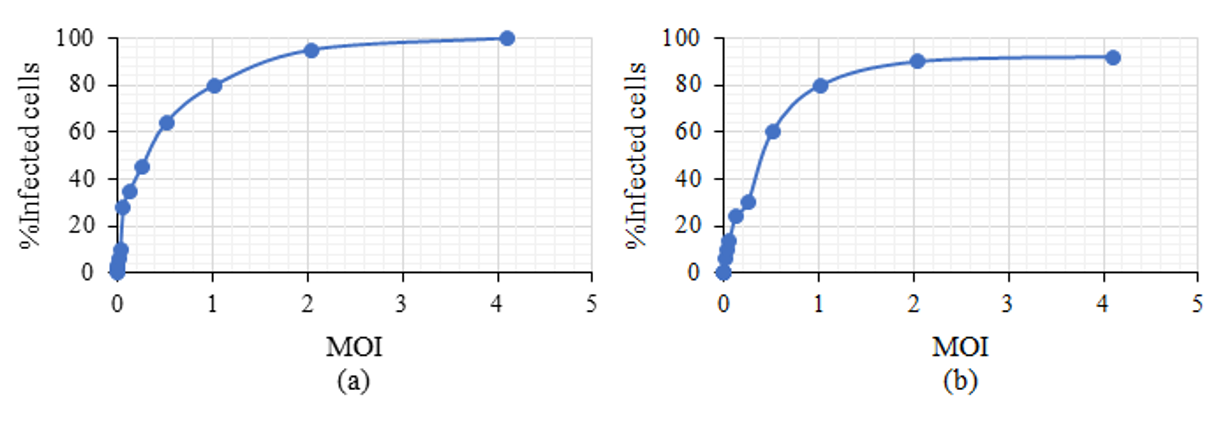 At each multiplicity evaluated, photographs of 6 random fields were taken, with a 20X objective for both cell lines. The images were processed in the ImageJ program (National Institutes of Health) and from these images, the number of total cells (marked in blue) and infected cells (marked in red) were counted to determine an average percentage value of infected cells to the different MOI evaluated.