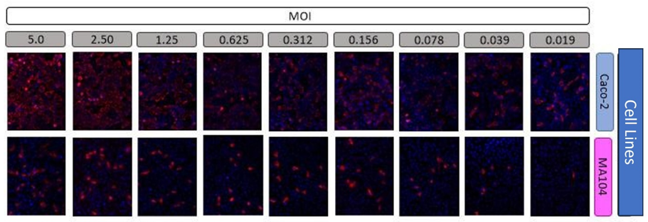 Figure 5: The pattern of infected MA104 cells behaves differently than that of the Caco-2 cell line when infected at increasing MOI with HAstV-8 at 18 HPI
