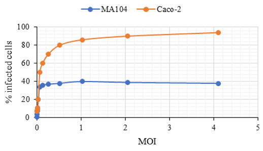 These results suggest that the permissiveness of the virus in MA104 cells is limited in some steps of the replication cycle after entry since once it infects the cell, its yield is notably lower in MA104 cells compared to Caco-2 cells.