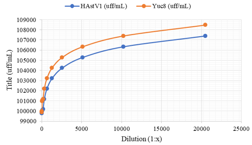 The experiment showed an unexpected pattern since the viral titer should remain constant throughout the graph, however, as we can see, at high concentrations (less diluted), the viral titer for both viruses increase (it should remain constant since it is of the same virus sample), it is from the 1:640 dilution onwards where the viral titer is conserved as the virus is diluted.