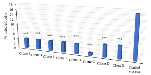 Figure 8: The infection percentage of the MA104 clones is up to 10 times lower than the parental cell line