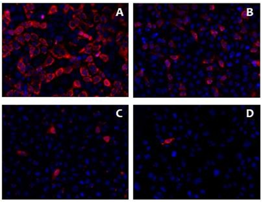 Clones obtained from MA104 infected with HAstV-8 are less infected than Caco-2 cells and the parental MA104 cell line, 18 HPI. The different cell lines were infected at MOI 2.5 uff/cell and the percentage of infected cells was detected by immunofluorescence assays. Cell nuclei are shown in blue, and infected cells (marked by the viral capsid proteins α-Yuc8) are shown in red. A) Caco-2 cell line. B) MA104 cell line. C) Clone 4. D) Clone C. The samples were visualized in an epifluorescence microscope (see Materials and Methods) with a 20X objective.