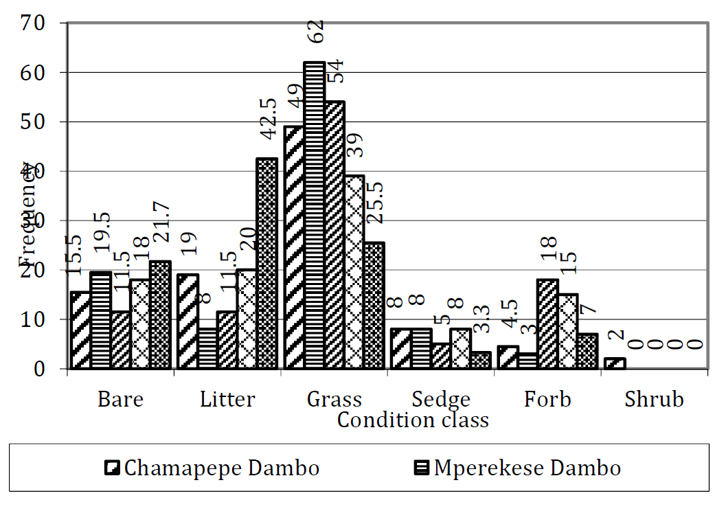 In Chamapepe dambo the the most dominant grass species was Loudentia simplex (Nees) Hu (20.5%) followed by Digitaria milanjiana (Rendal) Stapt (14.5%), and the least was Eragrostis superba Peyr (7.0%). Sedge had low frequency (8.0%) as well as Forb (7.5%). Litter was (19.0%) and bare was (15.5%).