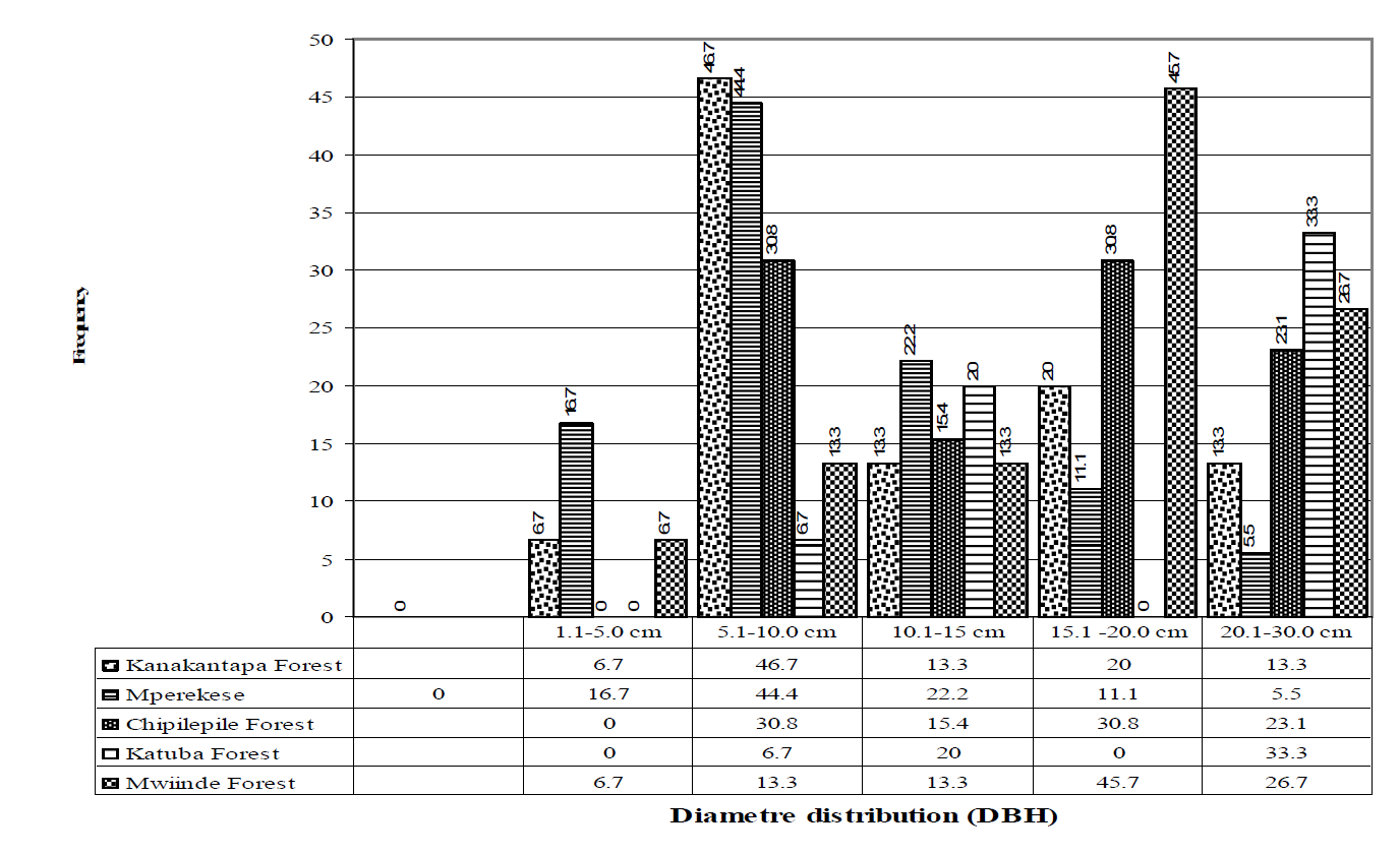 Comprehensive studies and well documented findings on Miombo structure, species composition, diversity and dynamics by have been done by several authors including Gonçalves et al., [37]. Variations in structure and composition is for the most part attributed to each species having different ecological needs as well as environmental changes caused by slash-and-burn agriculture, logging particularly for charcoal production and construction [37-40]. Our findings in this study of the five forest stands showed mixed structures of the diameter distribution and this may suggest severe disturbance through excessive land use. Obviously, the lack of recruitment of the young tree species shown in Chipilepile and Kanakantapa forest stands in the diameter range of 1-5.1 cm may strongly suggest human disturbance through selective logging for poles and construction materials while the diameter distribution structure in Katuba and Mwiinde may suggest strong presence of slash and burn agricultural practices.
