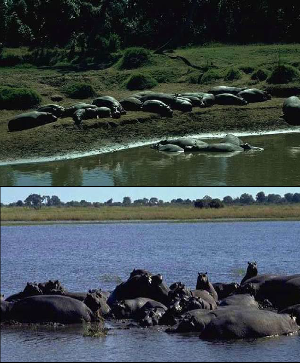 It can be said therefore, that the habitat requirements for hippopotamus in general, include a supply of permanent water large enough for the territorial males to spread out and adequate grazing open grassland within a few kilometers (2-5 km) of the daytime resting sites for which the Luangwa River offers in abundance (Figure 6a, b).