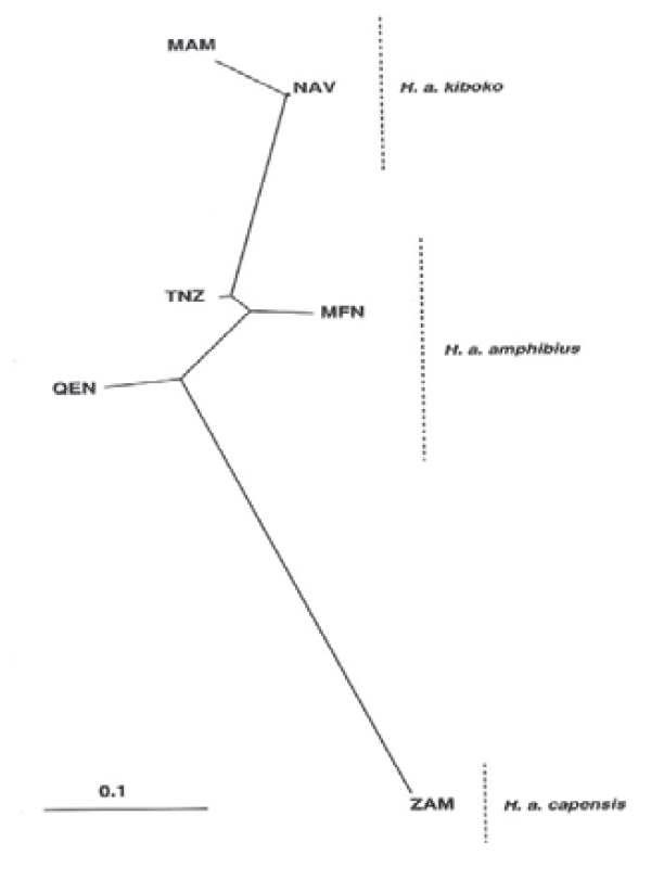 In the study by Okello et al., [30], populations belonging to H.a. kiboko and H.a. capensis subspecies were portrayed as distinct groups radiating from H.a. amphibius, the nominate subspecies. The neighbour-joining phylogenetic tree (Figure 14) however revealed no major geographical partitioning of haplotypes except for a few instances where haplotypes from the same locality clustered together, for example, MFN and MAM haplotypes.
