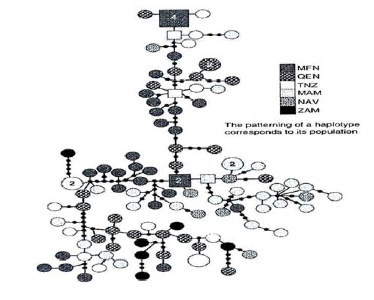 Figure 15: Statistical Parsimony Network Showing Relationships between Hippopotamus mtDNA Haplotypes from Eastern and Southern Africa. Haplotypes Are Represented as Circles and Squares for Ancestral Ones. The Minimum Number of Steps Connecting Parsimoniously Two Haplotypes is Indicated as a Thick Black Square and a Filled Small Circle Represents an Extinct or Missing Haplotype that Might have not been Sampled. The Size of the Square or Circle and Pattern Assigned Correspond to the Haplotype Frequency and Population, Respectively and Numbers in Haplotypes Correspond to the Number of Individual Sharing the Haplotypes [30]