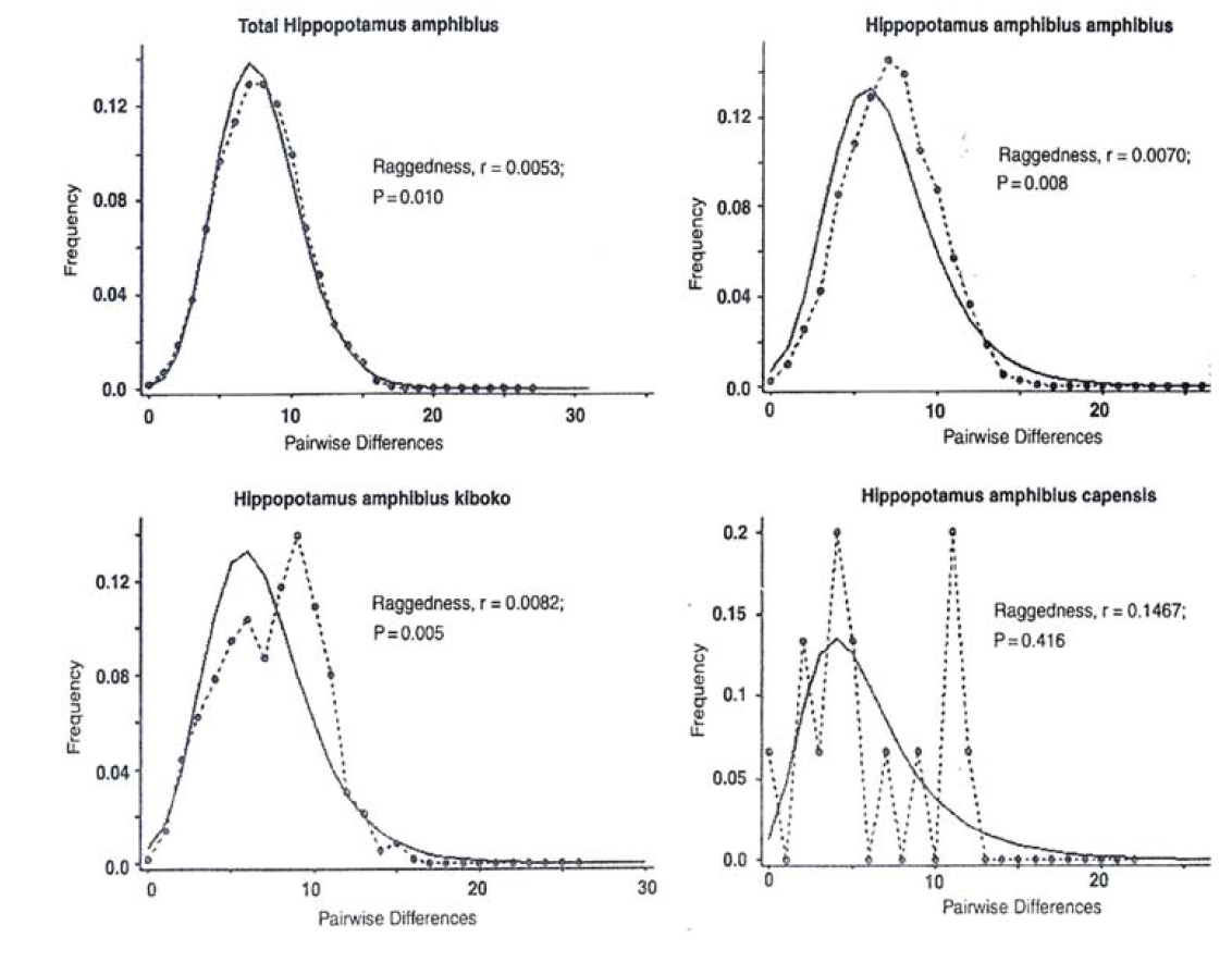Figure 16: Mismatch Distributions of Mitochondrial DNA Sequences of the Common Hippopotamus based on Pair Wise Nucleotide Differences in the Total Population and Subspecies. Solid Lines in the Curves Indicate the expected Distributions Under Expansion and Dotted Lines Indicate the Observed Distributions Under Population Expansion. The Raggedness Statistics and Corresponding p-values are Given