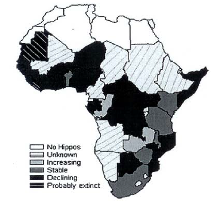 Given the potential loss of habitat due to human population expansion and civil strife in many parts of sub-Sahara Africa, the status of hippopotamus can be said to be uncertain in many countries. Civil war in Congo DRC, Liberia and Sierra Leone might have significantly reduced population status. Lewison [32], showed that populations were only increasing in Gabon, Zambia and perhaps Tanzania (Figure 17). From this assessment, it was found fitting that IUCN Species Specialist Group upgraded the species to International Red List of threatened species in 2006. The populations most at risk were the small populations in West Africa, where the distribution continues to be fragmented due to human population expansion and agricultural activities as well as civil wars. The recent attempt by Guinea supported bu other countries to uplist the CITES appendix listing fromn Appendix II to Appendix I on the basis of international trade is not supported by science. The major factors contributing to the loss of hippo in Africa is habiota loss and massive losses due to poaching in areas with civil conflicts and not international trade.