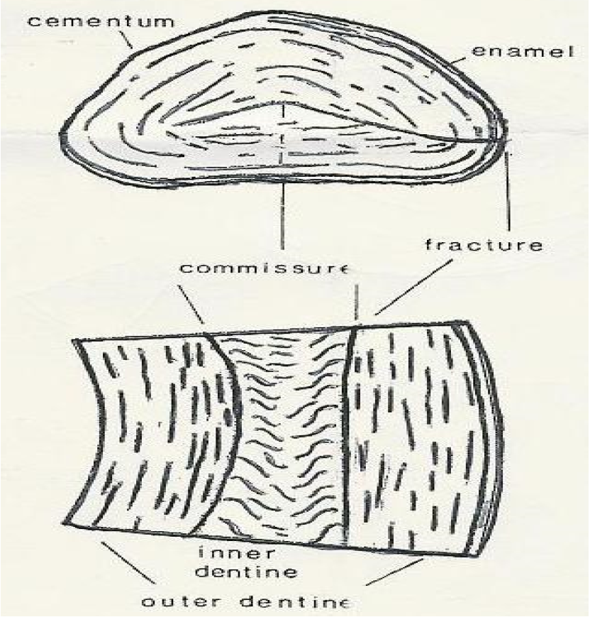 Figure 18c: Hippopotamus Incisor Showing Patterns of Lamellae in Transverse Section (Left and Longitudinal Section (right) [37]
