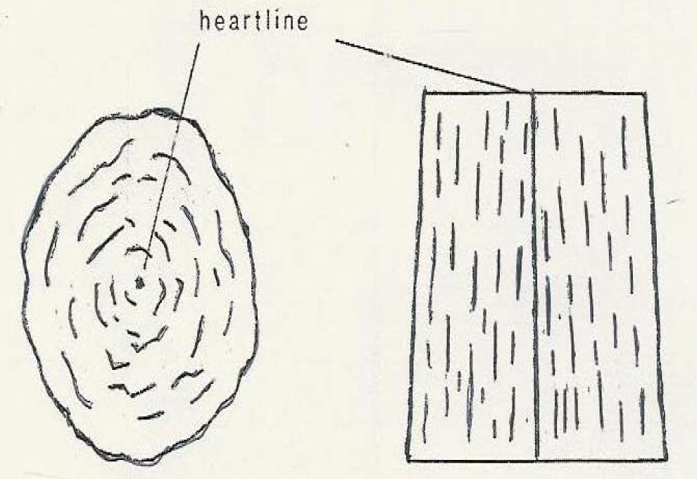 The longitudinal section shows the lamellae running parallel with the surface and curving toward the distal end of the heart line