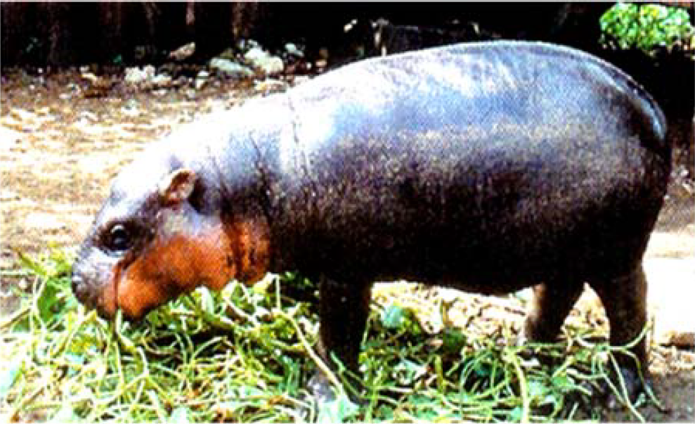 Which are, Hexaprotodon liberiensis that, is smaller than common hippopotamus, weighing about 270 kg and the shoulder height being 80 cm. Its distribution is restricted to West Africa. Unlike the common hippopotamus it has proportionally smaller, narrower head with orbits not raised above the skull roof. It has 38 teeth, compared with 42-44 in the common hippopotamus [9] (Figure 3).