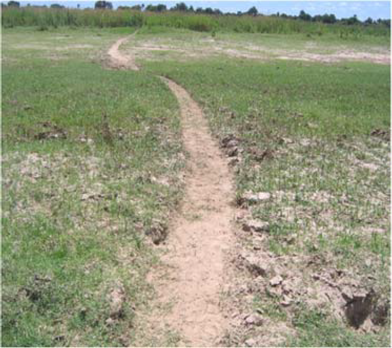 Grazing areas are not subdivided into territories and change with season and availability of forage [13]. To access grazing areas hippopotami, use established routes called hippopotamus pathways, where the ground eventually becomes bear (Figure 7). Where food is plentiful, they tend to remain in the vicinity of the resting pool but would move freely up to five or in some cases up to 10 km when food is scarce or during drought (personal exp.). With the meandering of the Luangwa River and the rich alluvial depoisits, foraging areas are always within in most instances within 5km of the river banks which makes the Luangwa River a very unique hippo habitat and perhaps also reposible in part for the super abundance of hippo not recorded anywhere among the range states.