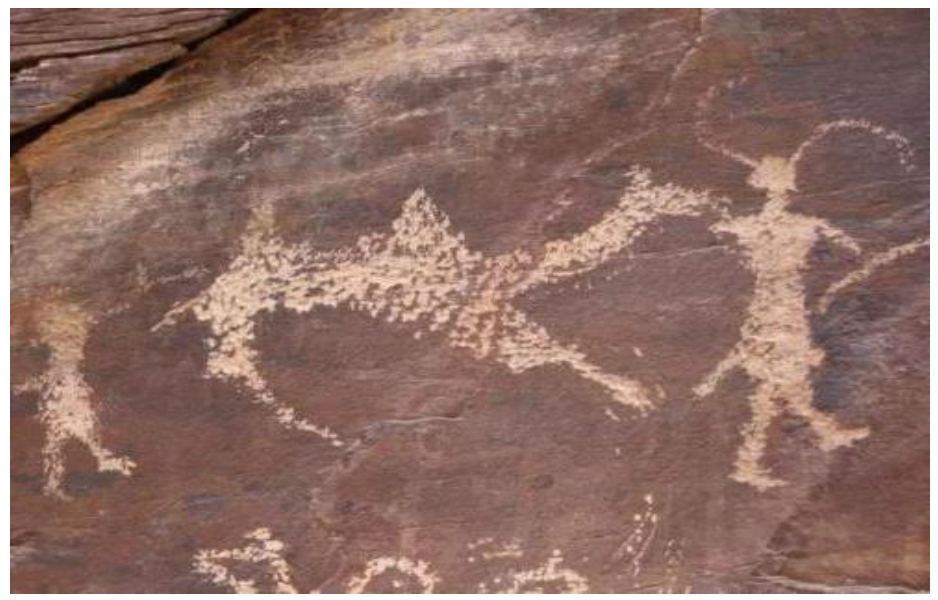 There are also depictions of camel groups in the rock arts. As shown in Figure 6, the composition of the picture is an oblique triangle. The three camels are located on three corners. The heads of the camels are all to the right. The shape and size of the camels are similar. The front legs are bent forward. The camels in the picture are natural and vivid with a strong sense of decoration.