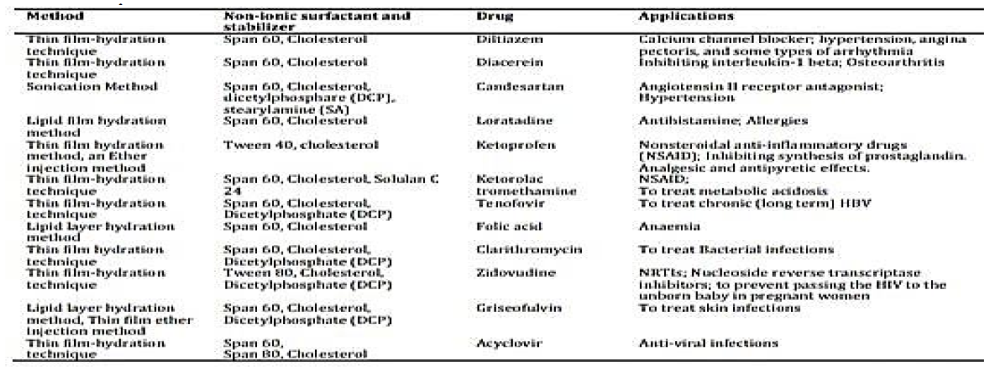 Table 1: Methods of Preparation with Various Non-Ionic Surfactants and Stabilizer with its Applications