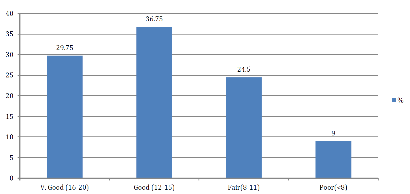 In the present study 29.75% (119) participants had very good knowledge (16-20 marks) towards Fungal Skin Infection (Ringworm), 36.75% (147) had good knowledge (12-15 marks), 24.5% (98) had fair knowledge (8-11 marks) and 9% (36) having poor knowledge (<8 marks). (Figure 1).