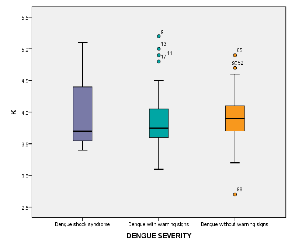 Median Potassium levels were high in group having dengue without warning signs (3.9) followed by dengue with warning signs (3.75) and dengue shock syndrome (3.7). Kruskal-wallis test was applied to compare the potassium levels among the groups. Kruskal-wallis test showed no statistical significant difference among the groups (p = 0.398) (Table 4, Figure 2).