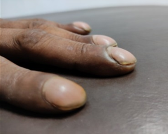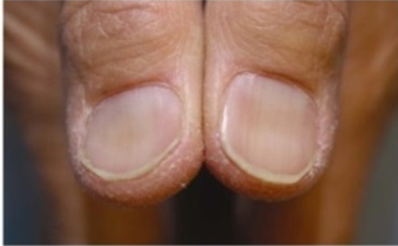 Clubbing: The finger nails have tended to bulge and are increased convex curvature in all directions and loss of the angle between nail and nail fold (Figure 1).