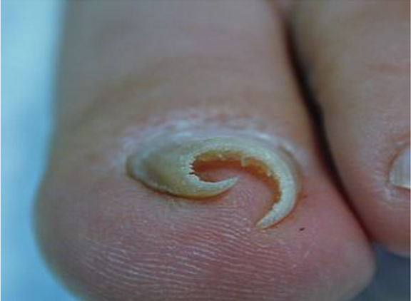 It is a condition where the nails become thicken, yellowish opaque and claw shaped or a ram’s horn (Figure 12). It is usually due to neglect or failure to cut nails for a long time. This condition commonly found in Old age.