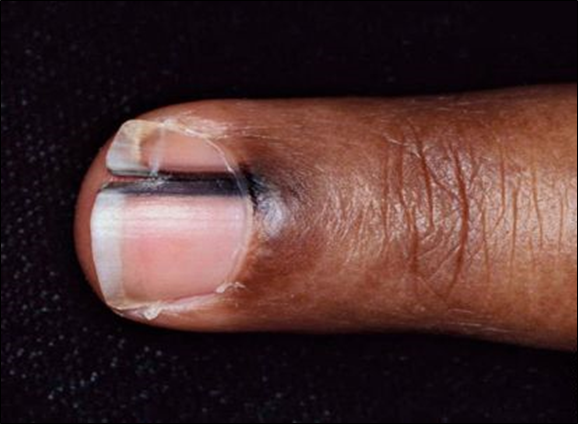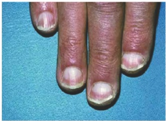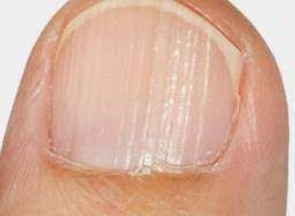 Longitudinal Striations: These are narrow furrows or grooves present the whole length of the nails. There may be associated with discoloration and thickening of the nail (Figure 17). This type of lines or ridge normally found on finger nails due to normal ageing process, hence it is very common in old age.