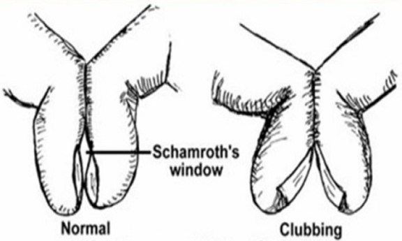Schamroth’s Window: It is seen when the dorsal aspects of two fingers from opposite hands are opposed, revealing a window of light, bordered laterally by the lavibond angles. As this angle is obliterated in clubbing, the window closed (Figure 2)