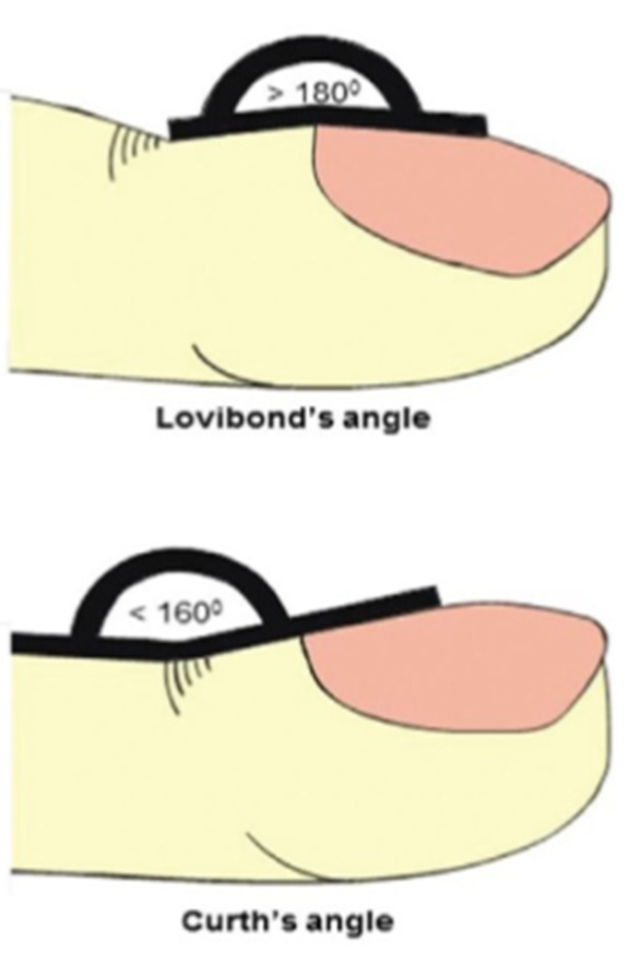 Lovibond’s Angle: The junction between the nail plate and the dorsal surface of the distal phalanx forms an angle, which is normally less than 160 degrees; however, this is altered to over 180 degrees in clubbing (Figure 3)