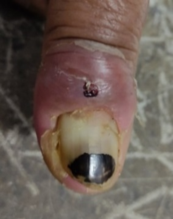 Consequences of injuries to nails in the first stage. After tearing of hang nail, whitlow rapidly forming on palmer surface of right index finger; intense throbbing, swelling, redness and acute darting pain. Whitlows the result of punctured wound; needle pricks and splinter.