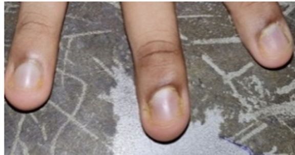 The word “phagia” Derived from the greek word ‘phegein’ meaning ‘To eat’ or ‘devour’. It an abnormal habit of consumption of finger nails by biting them (Figure 7). This type of habit commonly found in children. This habit may lead to infection of nail bed like paronychia as well as GI troubles. Suggest: Anxiety neurosis.