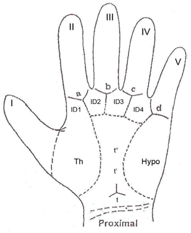 Galton F [2]1 classified quantitative categories of total true palmar pattern in different areas of palm. The palm has been divided into several anatomically well divided areas to carry out dermatoglyphic analysis. These include thenar, interdigital areas-ID1, ID2, ID3, ID4 and hypothenar areas. The quantitative pattern types are subjected to chi-square test.
