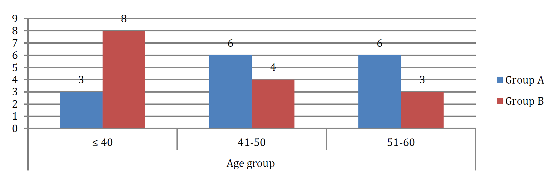 According to age distribution, in group A, 3(20%) were≤ 40 years, 6(40%) were between 41-50 years and 6(40%) were between 51-60 years of age while in group B, 8(53.3%) were≤ 40 years, 4(26.7%) were between 41-50 years and 3(20%) were between 51-60 years of age. The p value was calculated to be 0.159 which was found to statistically non-significant. (Figure 1)