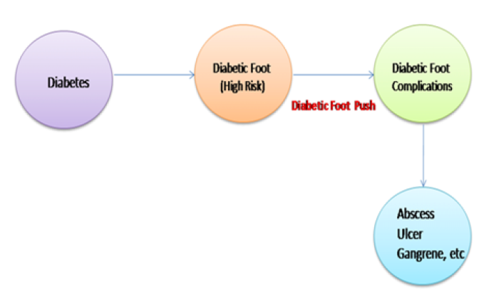 The term “Diabetic foot Push” was recently introduced by Amit Jain from India [8]. Diabetic foot push is prolonging the time interval from high-risk foot to development of any complications in foot like abscess, gangrene, ulceration, etc. (Figure 1).
