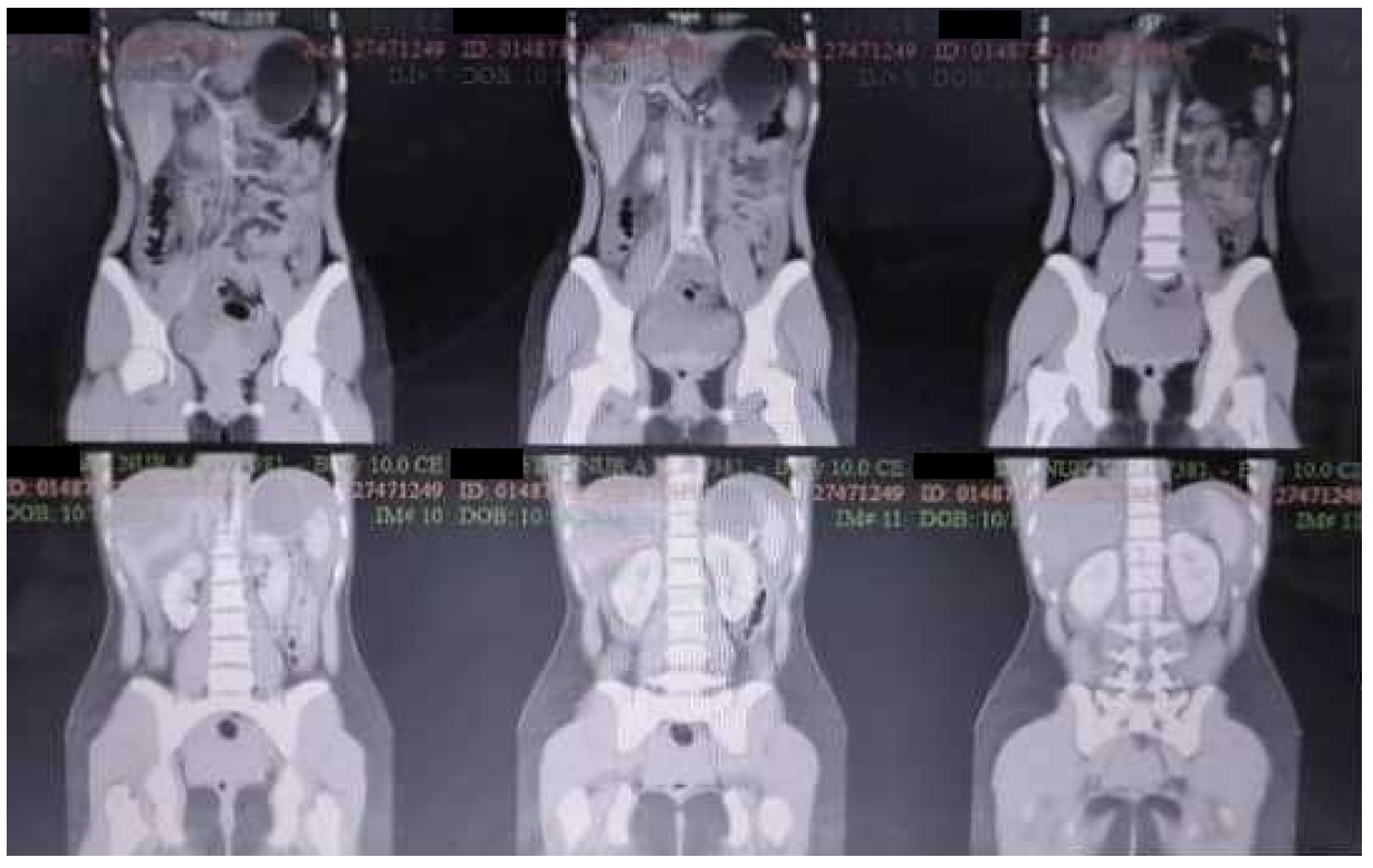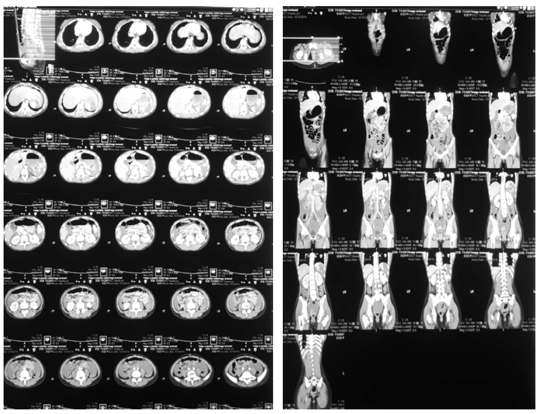 Later, the patient was sent to radiology for abdominal CT examination, and the results showed liver rupture grade IV and splenic rupture grade II (AAST rating scale), with free fluid in the abdominal cavity (Hematoperitoneum) (Figure 6).