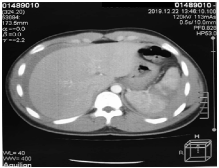 Then, the patient was sent to radiology for abdominal CT examination. The results showed grade IV Spleen Injury (AAST rating scale) and free fluid in the abdominal cavity (Hematoperitoneum) (Figure 2).