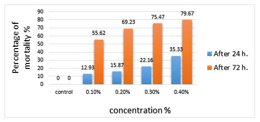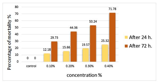 Figure 1 shows the effect of different concentrations of growth regulator on the mortality rates of house fly eggs after 24 and 72 hours of application. The results indicated that the lowest mortality rate was 12.93% and the highest rate was 35.33% after 24 hours of application of growth regulator. While after 72 hours the lowest rate was 55.56% and the highest rate was 79.47%.