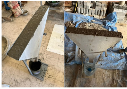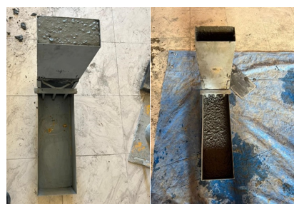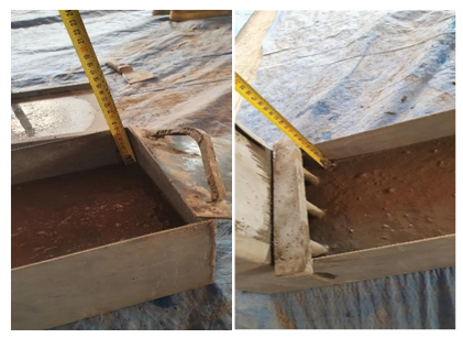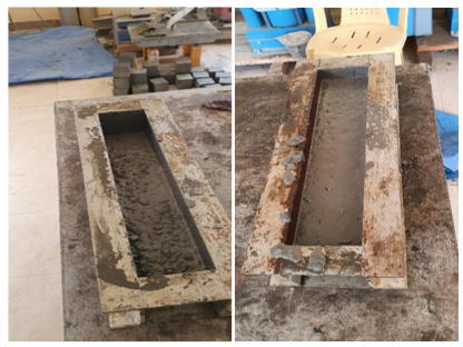 بعد عملية خلط خرسانة والفحوصات تم تحظير نموذجين من (قوالب عتب او موشور قياسية) بأبعاد cm( 10*10*50) حسب المواصفة الاوروبية EFNARC)) لكل خلطة خرسانية وبعد اكتمال عملية خلط يتم تفريغ الخلطة في الوعاء كبير لزيادة تجانس ومزج مكونات بصورة جيدة وبعد ذلك يتم تحظير القوالب و يتم تنظيفها وبعد ذلك ندهن السطح الداخلية للقوالب قبل عملية الصب لمنع التصاق الخرسانة بالقالب يتم مل ئ قالب بثلاث طبقات وعند اضافة كل طبقة يتم رص القالب بواسطة عص ى رص بضربات خفيفة لغرض اخراج فقاعات الهوائية محصورة وعند رص طبقة الاخيرة يجب ان يراعي ملئ القالب بالخرسانة حتى تعلو حافة القالب لكن ليس اكثر من 6 ملم وتوضع العلامات على النماذج لبيان تاريخ الصب وغيرها من المعلومات المهمة لتميز النماذ ج كما موضح في الشكل.13