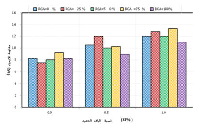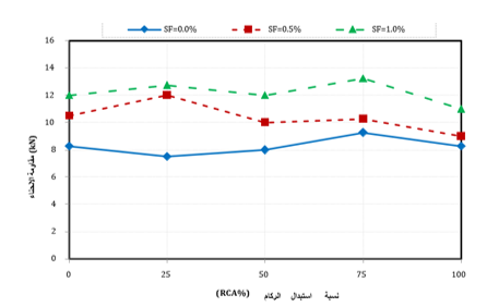 بصورة عامة، فأنه يمكن ملاحظة ان هناك تحسن ملحوظ في قوة الانحناء كلما زادت نسبة الركام المعاد تدويره وكما موضح في الشكل 16. ان اضافة الياف الحديد الى الخرسانة يساهم في تحسين خواص الانحناء للخرسانة .بصورة عامة، فكلما زادت نسبة الياف الحديد ازدادت مقاومة الانحناء وكما هو واضح في الشكل 17.