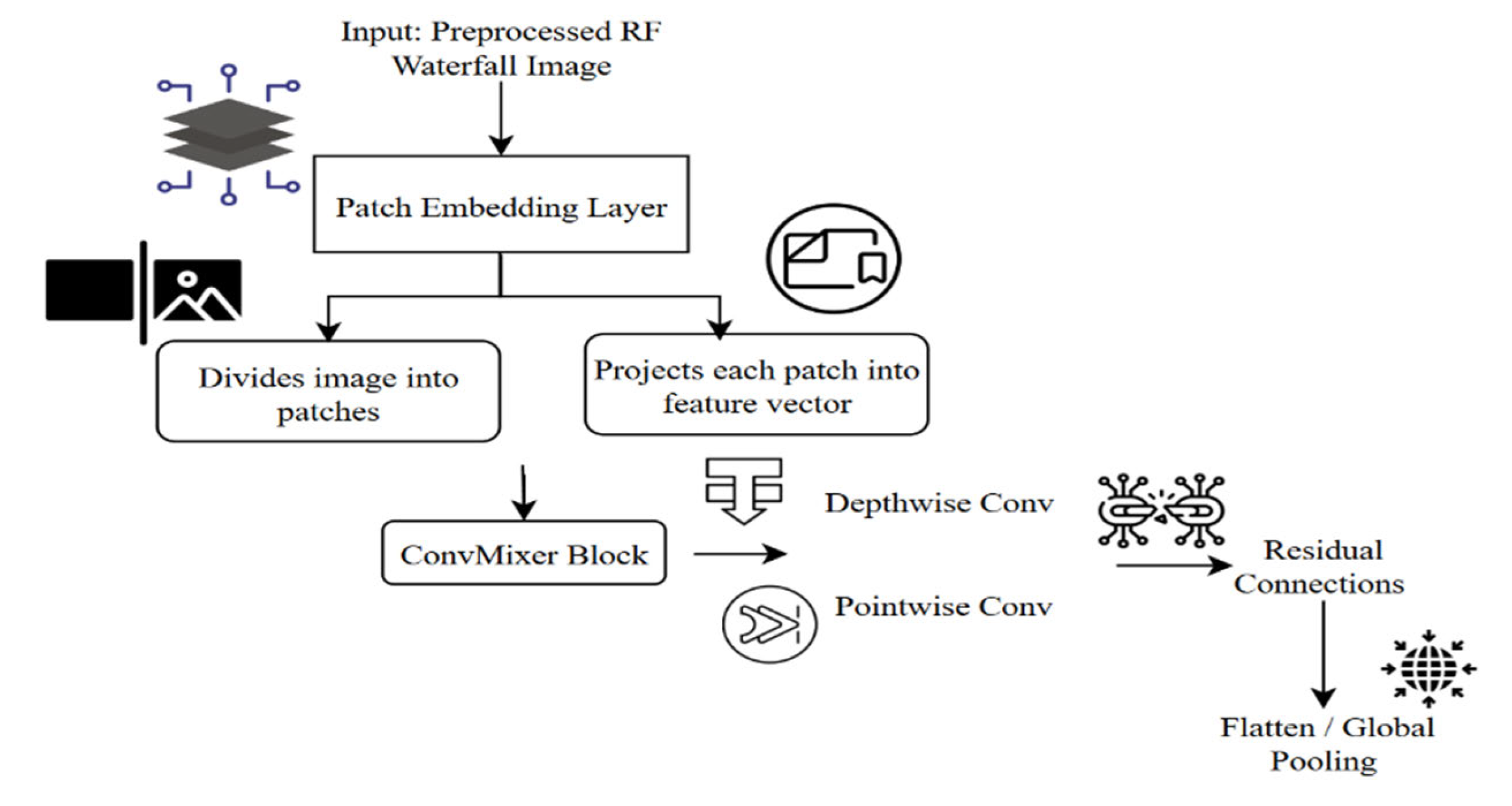 The encoder’s task is to transform the processed RF images into a small latent representation that contains all significant modulation information. Although standard convolutional neural networks (CNNs) are efficient at extracting local spatial information, ConvMixer is a more efficient and flexible approach. ConvMixer is a patch-based, convolutional-designed processor that enables it to learn both local and global features simultaneously. This workflow follows the principle that every RF waterfall image is divided into patches, which are subsequently processed using depthwise and pointwise filters, as shown in Eqn. (6).