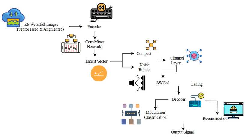 Once the encoder extracts latent features (signal-invariant), they are passed through a differentiable channel simulation that completes the model via noise and fading, followed by the decoder, which reconstructs RF images or predicts modulation classes (see Eqn.). (11). This ensures the end-to-end system is reliable when impairments are introduced. ConvMixer or MLP-Mixer will be used for dataset training in the model, as these models capture better local and global RF features than traditional CNNs. Mini-batch optimization is used with full gradient computations with TensorFlow or PyTorch. Latent, federated learning maintains robustness and noise resistance for signal reconstruction. This integration provides an efficient, adaptive, and accurate AI-native communication system.