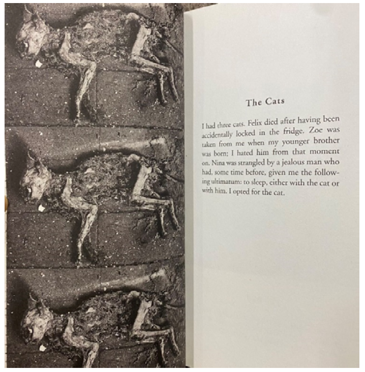 It is the alleged tragedy of Calle losing three beloved cats that were killed in an accident (might be a murder), taken away, or strangled to death. The photograph on the left page is a composed picture-a repetition of three identical photos of a decayed dead cat. Although the species (cat) and the number (three) fit the narrative, readers still "cannot be sure at the level of the referent." In other words, the photograph and narrative are not "co-referential" [1]. If readers only look at the photograph, they might only think of one dead cat whose photograph is placed here three times and if they have no knowledge of "cat archeology," they wouldn’t recognize the cause of its death. If they only read the narrative, they might imagine the scenes of two poor cats dying (since Zoe was only taken away, it might not be dead in reality. But to Calle, it is already a "dead" cat because she might never see it again). However, the photograph falls short of readers' expectations, stifling their imaginations and degrading their visual experience to only three identical cat corpses. This displacement, or "nonconnection," makes the whole story appear confusing and ironic [1], because neither the photograph nor the narrative is reliable. Ultimately, readers are "obliged to disqualify any possibility of dealing with real photos of the three cats" [4] and only regard the photographs as a “monument” [1] or an "archive" of the three cats that Calle lost. This is the point at which the fiction (because the photograph cannot verify the authenticity of the story, it could be a product of imagination) enriches the photograph's denoted message-it bestows special meanings on this "might-be-random" dead cat and projects human memories on its cold corpse.