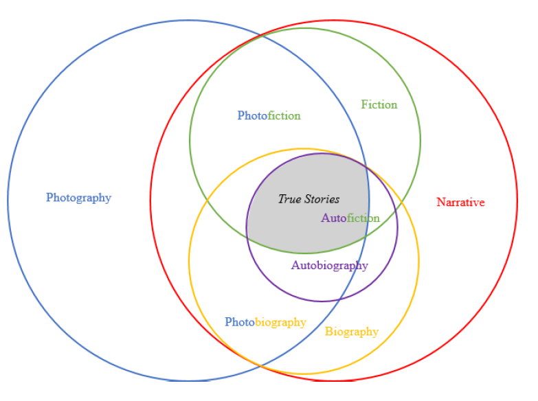 Through this "aesthetic choice" of applying photographs and fiction to her autobiographical narrative, True Stories is also classified as "autofiction," which is, to quote the definition of Philippe Lejeune, "a retrospective prose narrative which a real person makes of his own existence, when he emphasizes his individual life, in particular the story of his personality" [4]. In True Stories, Calle shows her personality through presenting carefully selected and edited episodic events in her life and since those events are narrated from the opposite direction in which they happened, her subjectivity and fictionality are inevitable [6]. With both qualities of "photobiography" and "autofiction," though untypical at both ends, the genre of True Stories can be defined as "photo (bio) graphical autofiction" [1] and is situated at the very center of the intersection of the three-the grey area shown in Figure 2.