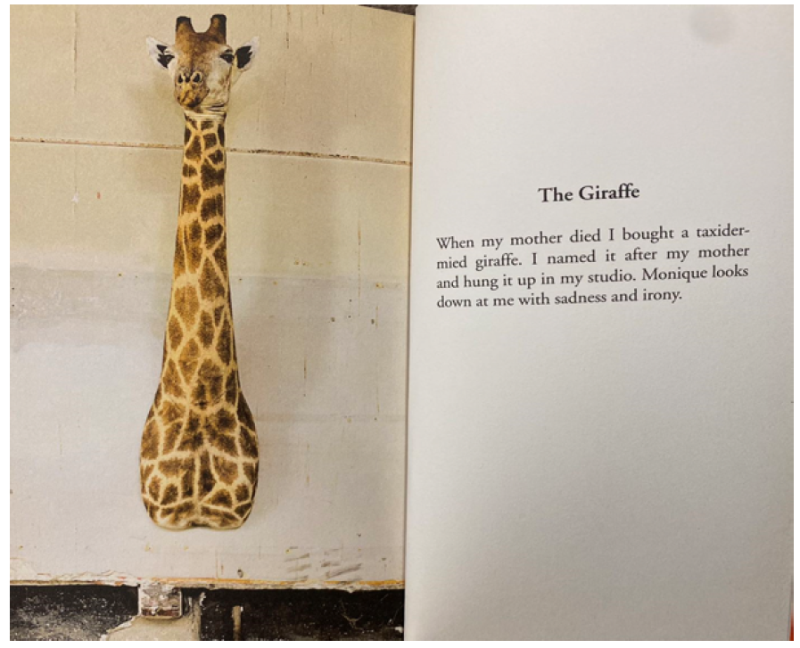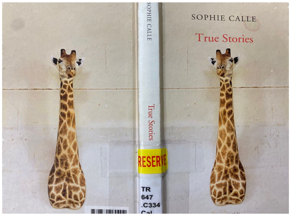 Phototextuality is a topic that many scholars are interested in while investigating Calle’s works. According to Gratton, it is the study of “different kinds and degrees of relation that hold between image and language across a wide range of contexts” [1]. Since the taxidermied giraffe as the cover is discussed above, it is time to look into its story and analyze the phototextuality.