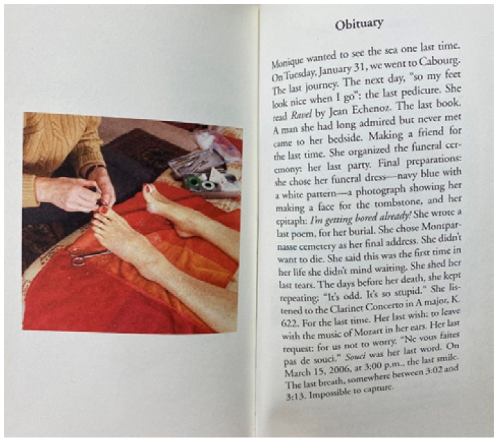 At first glance, though the story is about the last few things Calle’s mother Monique did before her death, Calle narrates it in a rather "icy" way [13], seemingly without any emotion or feeling attached to it. This "coldness" is first shown in its title. Just like the genre of obituaries suggests, Calle's narrative is very objective, like a camera, making the story more of a "document." Yet with a closer look at the content, readers might notice that the information Calle provided is well-selected with special intentions, making it an artistic record of Monique's several particular final behaviors that convey a sense of melancholy and "reluctance to part" of both Calle and Monique. Since many of those behaviors were supposed to make people happy, like getting a pedicure, making friends with an admired person, having a party and listening to music, it is heartbreaking to read that Monique could never do these things anymore. The sharp contrast between words like "she didn’t want to die." "She doesn’t mind waiting," and Monique’s epitaph, "I’m getting bored already!" pushes this feeling to the climax. Within a few lines, an image of a woman who was depressed, desperate and afraid of her own death, yet still pretended to be optimistic and happy, was vividly constructed. Thanks to Calle’s artistic narration, Monique's final moment was also fictionalized in a tragic atmosphere. As the last lines wrote, "The last breath [...] (is) Impossible to capture." They reveal Calle's pity, powerlessness and sorrow towards the fact that even with the help of a camera [13], she is still unable to capture and hold back the fading of Monique’s life and soul (Figure 9).