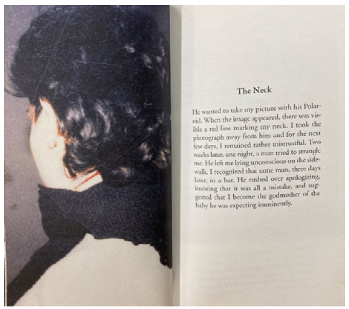 Another example is The Neck. It is a rather mysterious story about gendered violence [2]. The story starts with the "objectification" of women as Calle is asked to take a photo by a male and ends with an apology from a male stranger for his violent behavior, of which Calle was the victim. The photograph on the left page shows a red line that "resembles a puncture wound" [2] on Calle’s neck, which is referential to the narrative.
